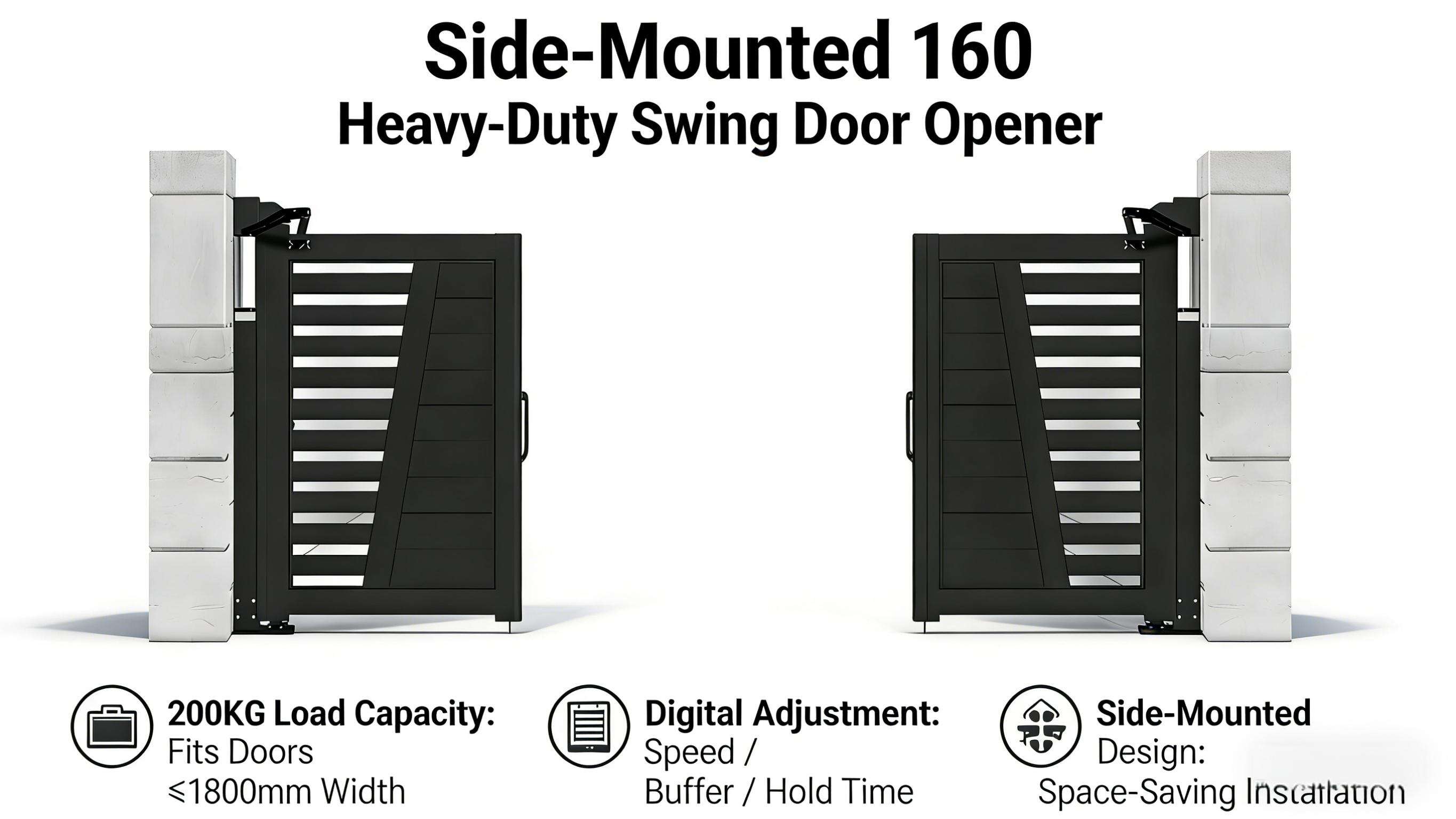 Este abridor automático de puertas de alta resistencia montado lateralmente de 200 kg es un dispositivo eléctrico inteligente diseñado específicamente para puertas batientes de carga pesada, adecuado para diversos tipos de puertas batientes, como puertas de madera, puertas de aleación de aluminio y puertas metálicas, con un ancho máximo de 1800 mm y un peso máximo de 200 kg. Se utiliza ampliamente en entornos interiores y exteriores, como tiendas, edificios de oficinas, hoteles y viviendas. Gracias a su diseño de montaje lateral, combinado con componentes de biela y soportes de fijación en forma de L, se adapta tanto a configuraciones de apertura de puertas por la izquierda como por la derecha, con pasos de instalación sencillos y sin ocupar excesivo espacio. Equipado con un sistema de control digital microinformático, permite ajustar en 1–10 niveles la velocidad de apertura/cierre, la velocidad de amortiguación y el ángulo de amortiguación (de 5° a 60°); además, el tiempo de retención en posición abierta de la puerta puede configurarse con precisión entre 1 y 254 segundos, satisfaciendo así las necesidades de paso en distintos escenarios. Ofrece múltiples métodos de control, incluidos el control mediante Bluetooth, el emparejamiento con mando a distancia y la vinculación con sistemas de control de acceso, e integra diversas funciones de seguridad, tales como detección infrarroja antiaplastamiento, protección del motor contra sobrecorriente/sobrecarga/cortocircuito y protección inteligente contra resistencia inversa. Asimismo, admite funciones adicionales como el bloqueo interconectado de puertas dobles y la vinculación con sistemas contra incendios, funcionando de forma estable en un amplio rango de temperaturas de −20 °C a 60 °C. Su carcasa de aleación de aluminio garantiza protección contra la lluvia y el polvo, convirtiéndolo en una solución altamente adaptable para el control automático y seguro de puertas batientes de carga pesada.